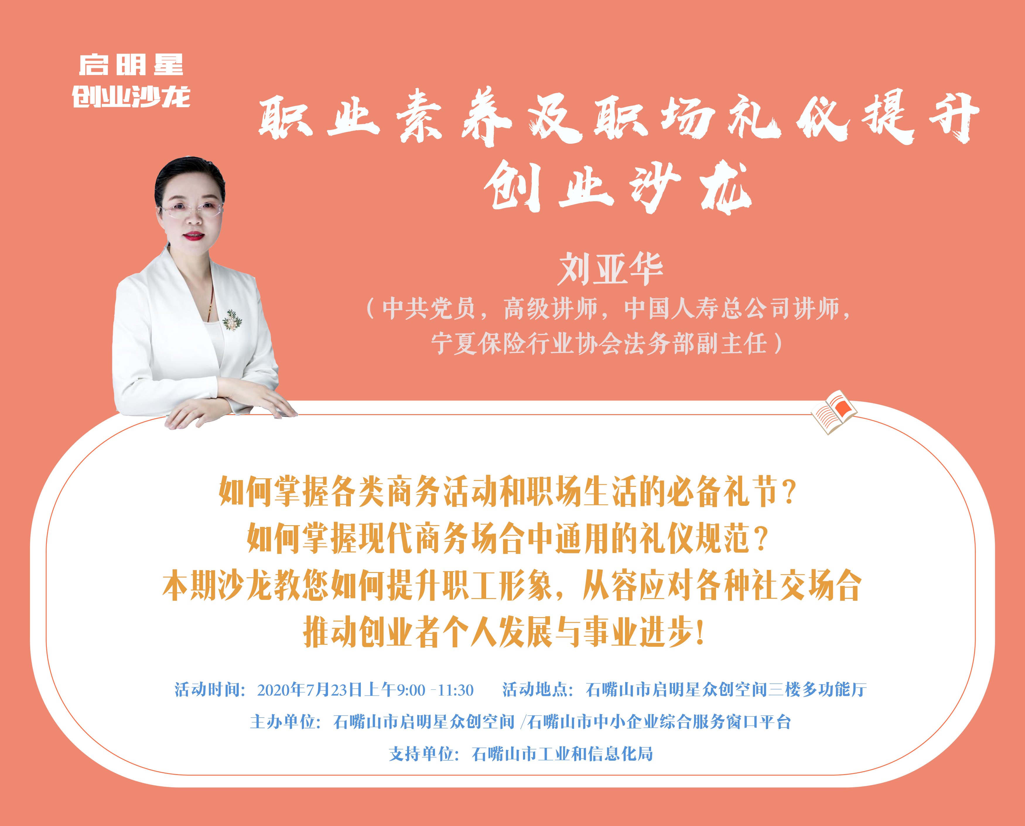 7月23日上午,启明星众创空间成功举办职业素养及职场礼仪创业沙龙,本次沙龙邀请中国人寿总公司讲师、宁夏保险行业协会法务部副主任刘亚华老师为来自全市的八十余名创业者进行职业素养及职场礼仪知识的讲解,创业者与老师互动频频,活动现场气氛十分活跃。