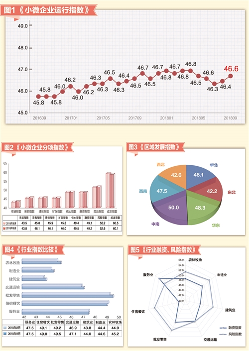 2018年9月份,“经济日报-中国邮政储蓄银行小微企业运行指数”(见图1)为46.6,较上月上升0.2个点,本月小微企业运行持续回升。