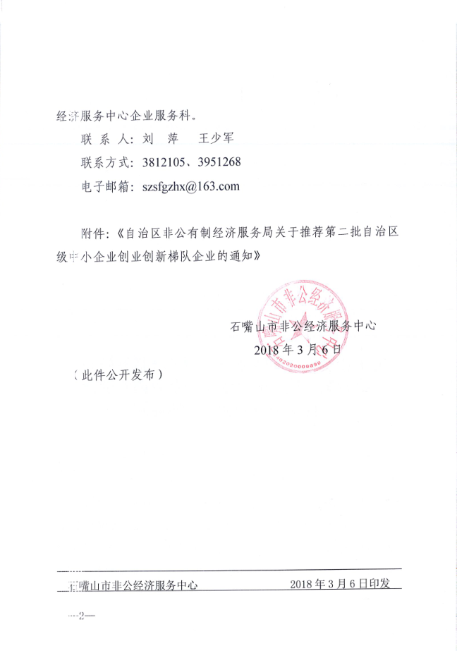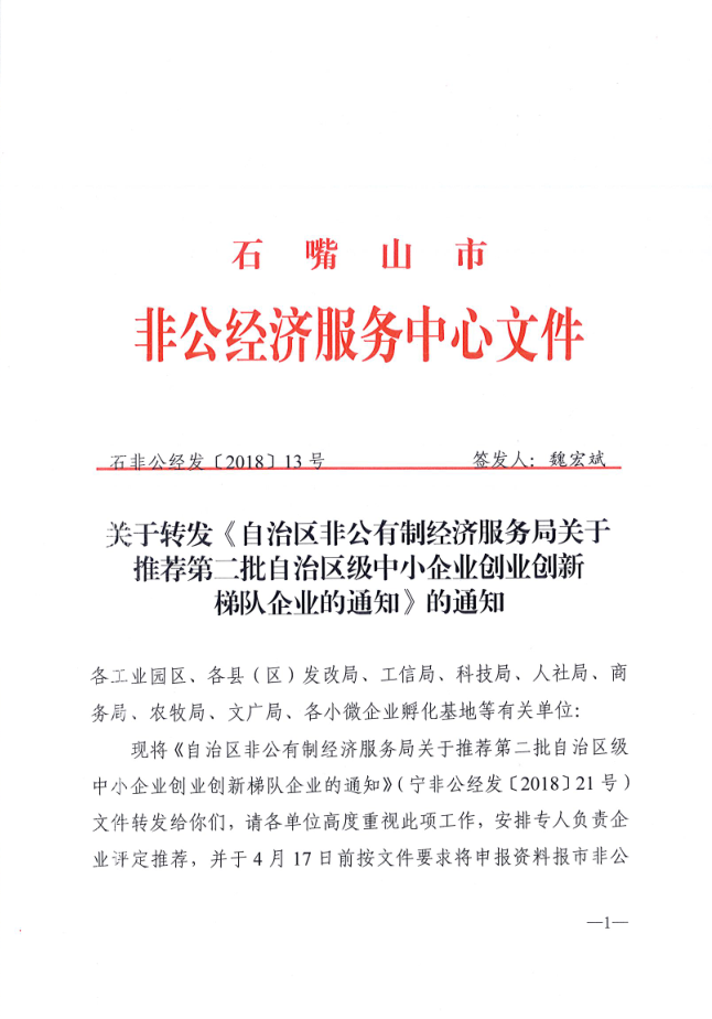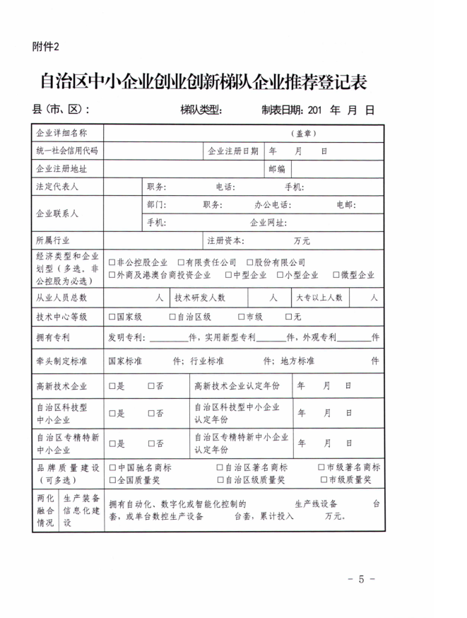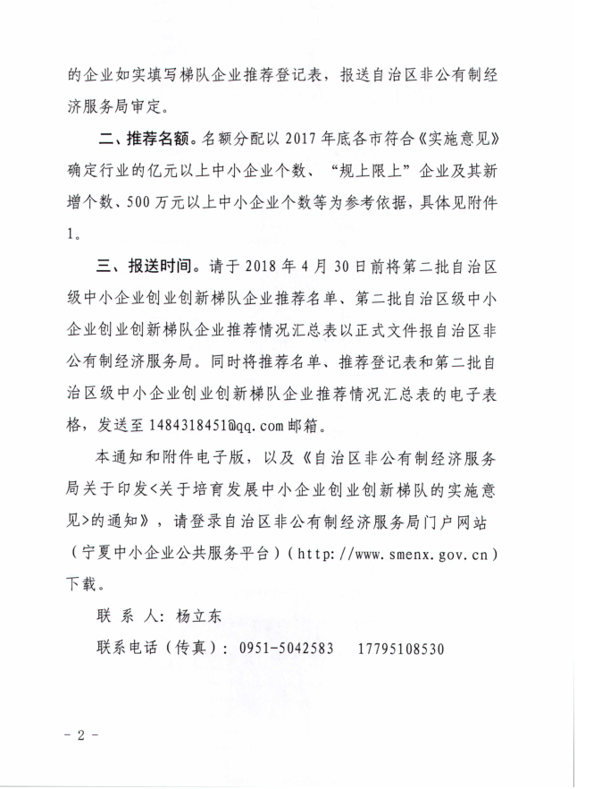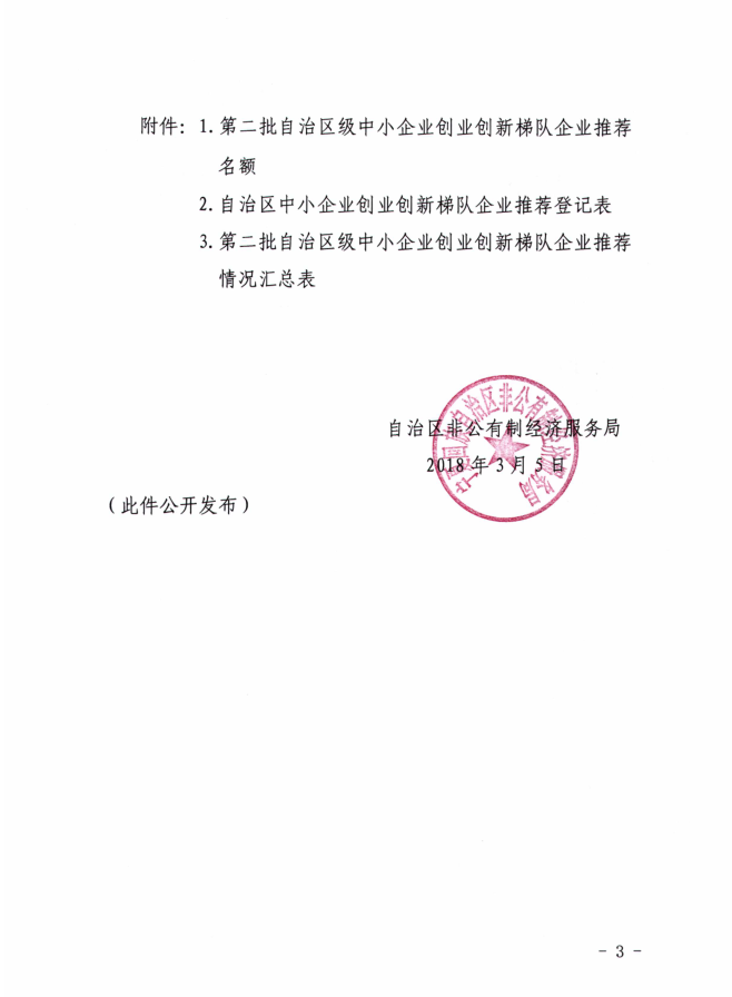 原文链接:关于转发《自治区非公有制经济服务局关于推荐第二批自治区级中小企业创业创新梯队企业的通知》的通知1.pdf