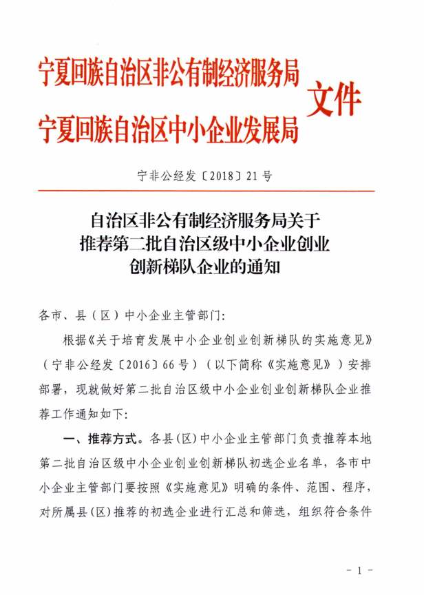 原文链接:宁非公经发〔2018〕21号 自治区非公有制经济服务局关于推荐第二批自治区级中小企业创业创新梯队企业的通知.pdf